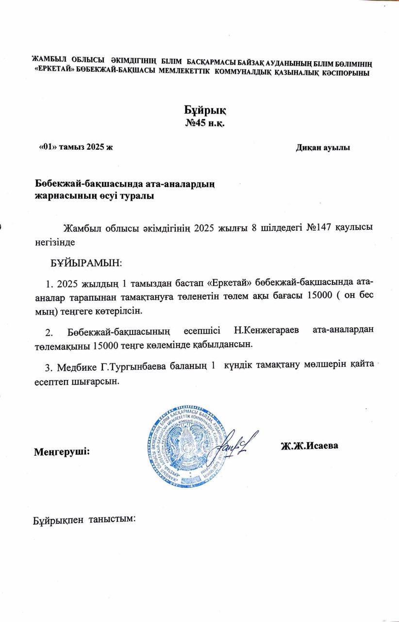 2025 жылдың сәуір айында «Балалардың балабақшада тамақтану сапасы және төлемақы мөлшері» бойынша жүргізілген сауалнама қорытындысы мен Жамбыл облысының әкімі Е.Қарашөкеевтің 2025 жылғы 8 шілдедегі №147 қаулысына «Ата-ана төлемақысының мөлшерін бекіту туралы» сәйкес 2025 жылдың 01 тамызынан бастап төлемақы 14000 тг болғандығын хабарлайиыз!