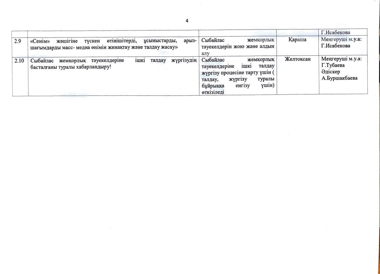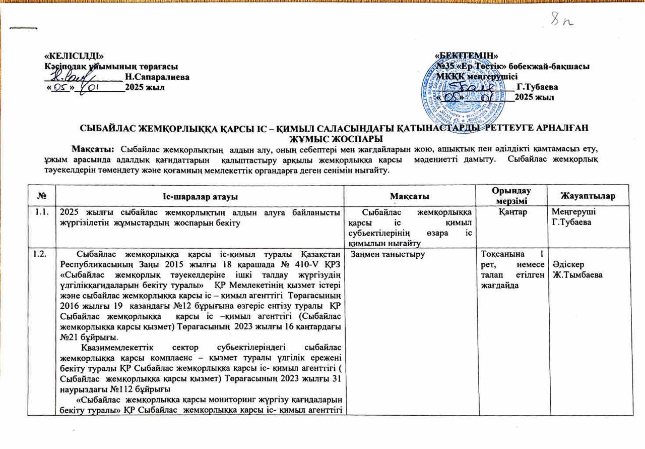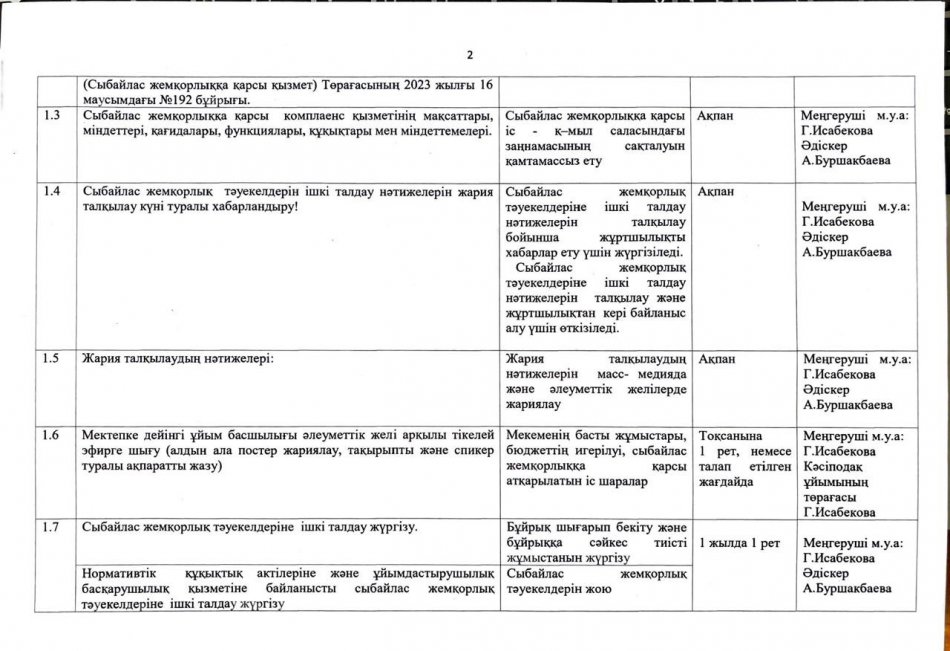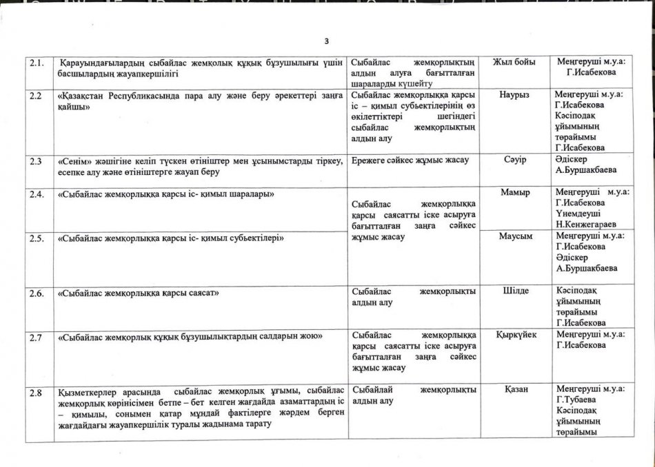 05 январь 2025 0 1 2 3 4 5 Сыбайлас жемқорлыққа қарсы іс-қимыл саласындағы қатынастарды реттеуге арналған жұмыс жоспары Сыбайлас жемқорлыққа қарсы іс-қимыл саласындағы қатынастарды реттеуге арналған жұмыс жоспары