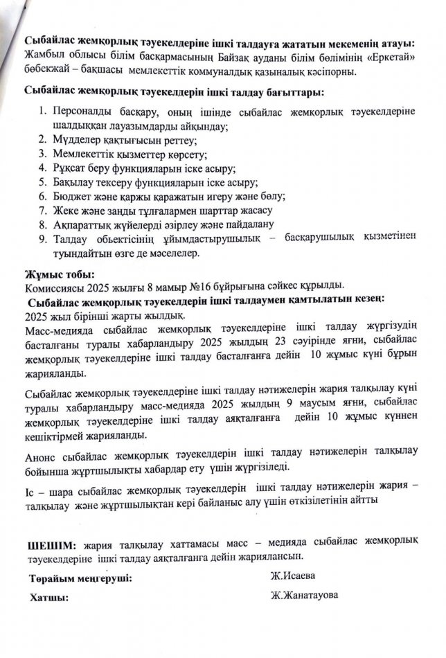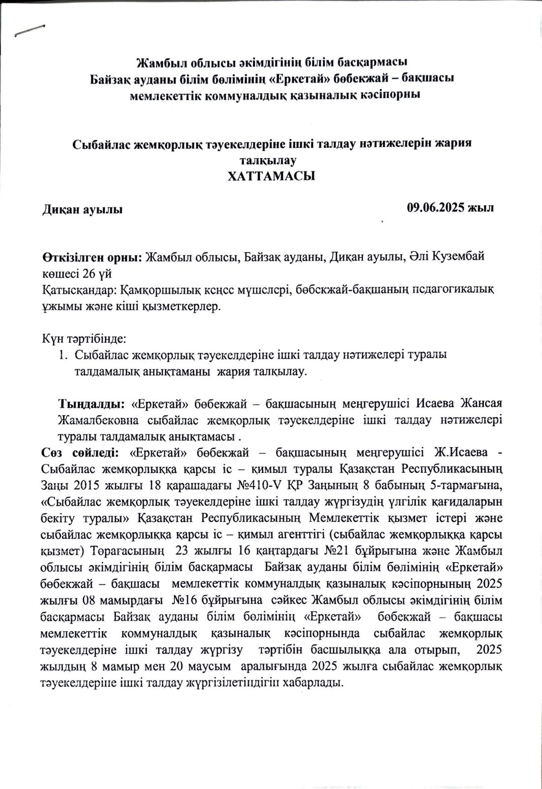 09 июнь 2025 0 1 2 3 4 5 Сыбайлас жемқорлық тәуекелдеріне ішкі талдау нәтижелерін жария талқылау ХАТТАМАСЫ